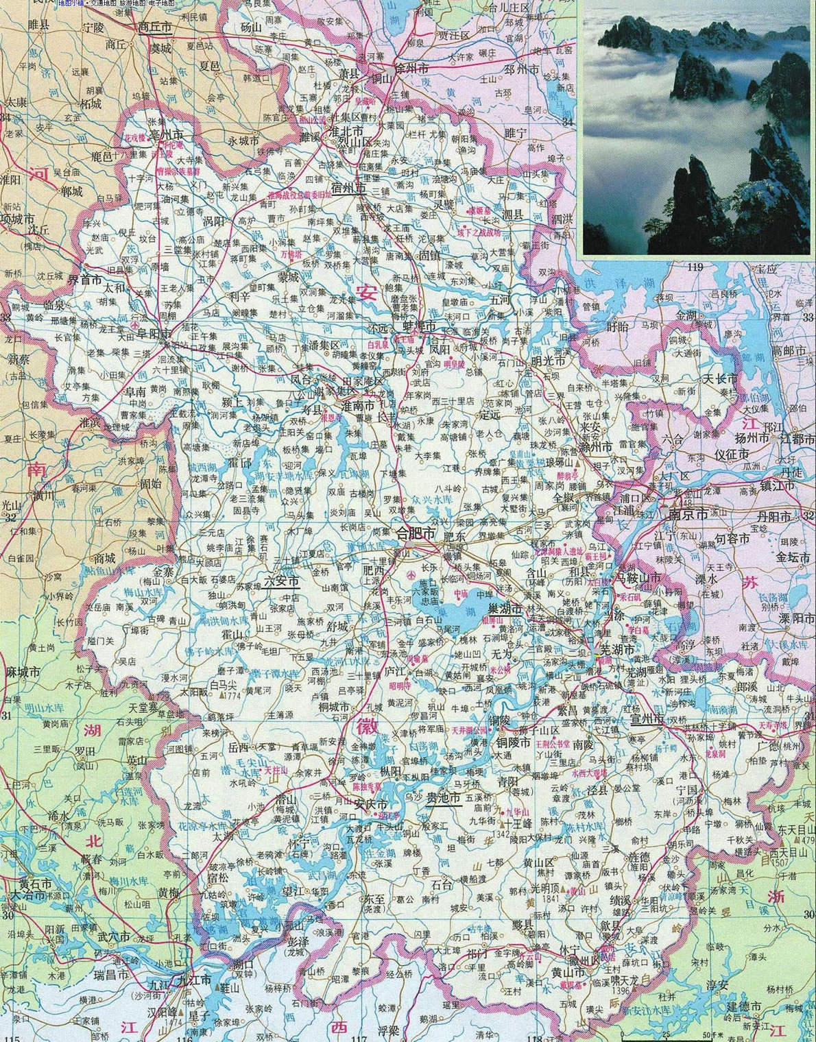 “兩根筷子夾著碗,屏障在西也在南,東面不平北邊平,黃山勝過(guò)九華山。”這首民謠形象地概括了安徽省的旅游地理面貌。兩條江河(長(zhǎng)江和淮河)像兩根筷子,巢湖如碗,西面的大別山和東南面的天目山如屏,北邊是一馬平川的江淮大平原。而皖南的黃山、九華山則是安徽最有名的風(fēng)景名勝區(qū)。