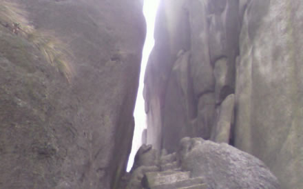 神秘谷,在天池峰南,又稱司元(玄)洞。神秘谷石由龍宮、迷宮、逍遙宮等組成,自龍吟虎嘯崖入口,穿過五指峰,緊傍飛來峰,環(huán)繞銜珠峰,直達(dá)渡仙橋,全長400多米,落差100多米。谷內(nèi)洞上有洞,洞里有洞,有的相連,有的間隔,道家視此地為洞天福地,道書稱之為第十四洞天。舊志稱此洞“空邃可容萬余武,下有水晶巖,直通滄海。后呼為總官洞!