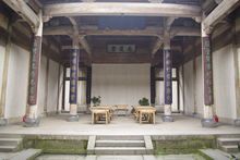 前廳是整幢房子中最精華的部分,大門后面聳立著一幅威儀的中門,在中門“!弊值纳戏剑傆幸环镜瘛鞍僮郁[元宵”圖,圖上雕刻著100個(gè)小男孩過元宵鬧花燈時(shí)的情景,這正是古代“多子多!眰鹘y(tǒng)觀念的生動(dòng)寫照,“百子鬧元宵”圖兩邊的“商”字斗拱上則分別雕有四出《三國演義》的戲文,斗拱的上方雕有“南、北”財(cái)神,“南、北”財(cái)神的上方是閣樓護(hù)板,在此,汪定貴設(shè)計(jì)了“漁、樵、耕、讀”四根木雕立柱,分別代表了古代的四種職業(yè)。