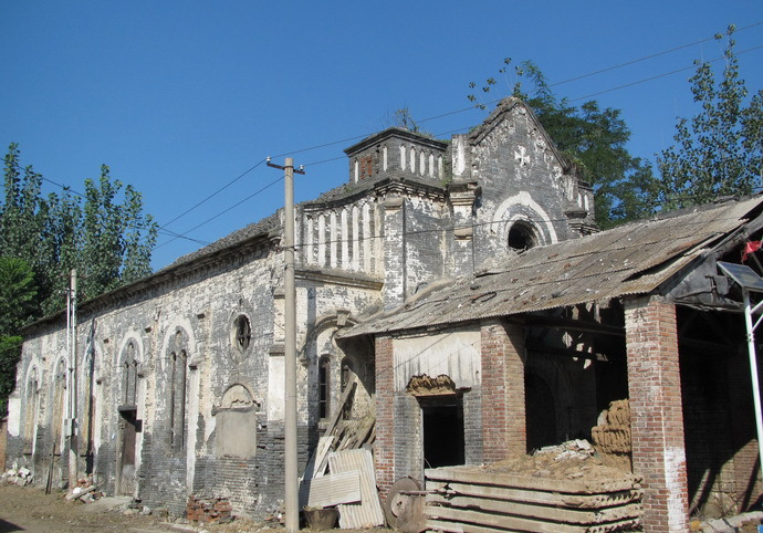 太和莊天主教堂 太和莊天主教堂,創(chuàng)建于民國(guó)三年(1914年),解放后即棄置不用。坐北朝南,是一座法國(guó)天主教教堂建筑,是房山區(qū)最早建立的教堂,也是房山區(qū)唯一一座保存基本完整的未經(jīng)拆改的教堂。面闊三間,進(jìn)深六間。山墻頭一間兩側(cè)開(kāi)券門。板瓦頂清水脊。堂內(nèi)有兩排八角磚柱。盡頭設(shè)石供桌,現(xiàn)已無(wú)存。