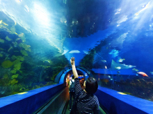 有金色的陽(yáng)光、白色的沙灘、棲息在淺水海域的潮間生物。模擬生機(jī)勃勃的仿真海岸線長(zhǎng)達(dá)48米,游客傾聽著輕柔的海浪,可以親手觸摸形態(tài)各異的海洋軟體動(dòng)物;孩子們?nèi)脒M(jìn)觸摸池中,能體驗(yàn)海水的感覺和與大海龜嬉戲的樂(lè)趣。