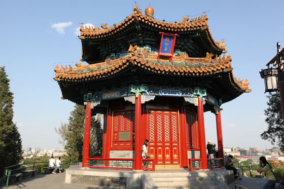 萬(wàn)春亭:位于景山的中峰,中峰的相對(duì)高度為45.7米,是北京城南北中軸線(xiàn)上最高和最佳的觀(guān)景點(diǎn)。萬(wàn)春亭位于景山最高處,建于乾隆十五年(1750年),是北京南北建筑中軸線(xiàn)的基點(diǎn)。被譽(yù)為北京中軸線(xiàn)上的制高點(diǎn),京華覽勝第一處。亭高15.38米,平面呈四方形,為三重檐四角攢尖頂,上檐和中檐均為九踩三昂斗拱,下檐為七踩重昂斗拱,黃琉璃瓦覆頂綠剪邊,檐上有琉璃寶頂,建筑面積296.5平方米。萬(wàn)春亭的彩繪稱(chēng)為:旋子大點(diǎn)金龍錦枋心,這也是中國(guó)皇家等級(jí)最高的彩繪形式。萬(wàn)春亭內(nèi)供奉著“毗盧遮那佛”,毗盧遮那佛也稱(chēng)為大日如來(lái)佛,是釋迦牟尼佛的法身。毗盧遮那佛為密宗金剛界五方如來(lái)之首,在五方佛中代表法界體性智。亭中所供原佛像于二十世紀(jì)六十年代被損毀,重塑歸安后于2000年正式對(duì)外開(kāi)放。