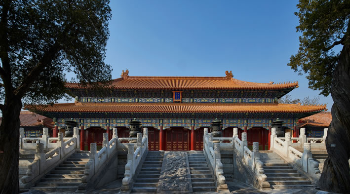 衍慶殿:在西。黃琉璃筒瓦歇山調(diào)大脊,面闊3間,進(jìn)深1間,前后帶廊。重昂五踩斗拱,旋子彩畫(huà),四周有石護(hù)攔。