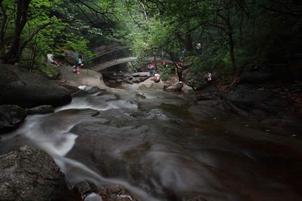 云岫谷景區(qū) 云岫谷景區(qū)位于新城子鎮(zhèn)遙橋峪村,海拔2116米,景區(qū)內(nèi)植被覆蓋率達(dá)95%,集危峰兀立、怪石嶙峋、洞穴、峽谷、河溪、潭瀑、花卉、森林為一體,野生動(dòng)物眾多,古堡、敵樓、烽火臺(tái)、營(yíng)城、水庫(kù)等人文資源豐富,尤以水秀石紅的地質(zhì)現(xiàn)象和冰川漂礫奇石出奇。景區(qū)內(nèi)山、石、洞、谷、河、潭錯(cuò)落有序,從串珠湖到傳說中的七仙女下凡沐浴的七仙潭,自然景觀達(dá)40余處;此外還有劉伯溫草廬、烽火臺(tái)等人文景觀。 云岫谷景區(qū)外圍的霧靈湖始建于1984年 ,是一座中型人工湖,流域面積178平方公里,庫(kù)容量2000萬立方米。它坐落于霧靈山腳下,山清水秀,空氣清新,游霧靈湖、享生態(tài)度假,住民俗新村、體驗(yàn)風(fēng)俗民情;乘船游霧靈湖,欣賞環(huán)山紅葉。霧靈湖主壩是華北唯一一座水泥鋼筋結(jié)構(gòu)的空心壩,是休閑度假的好去處。1991年,時(shí)任中共中央總書記的江澤民同志來此度假,面對(duì)青山秀水,他欣然題詞:“湖光山色,盡收眼底”。