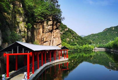 蒼龍峽觀飛龍瀑:古人曾賦詩蒼龍峪:“蒼龍日暮還行兩,老樹春深更著花”。傳說蒼龍峪歷年夏季水量大增,溪水奔流不息,老龍行雨所致,加之峪內(nèi)植被好,山色蒼茫,故名“蒼龍峪”。蒼龍峪由溝口至飛龍瀑,全長約2公里,沿溝口向溝內(nèi)的溪流行走,石磴迂回, 步步登高,沿途有“浴鳳潭”、“月波潭”等大小泉潭18處,有“涵云”、“浴露”、“危石泉聲”等石刻小品,可供游人攝影留念。沿溪流兩岸山勢崢嶸,草木繁茂,行至最高處,但見“飛龍瀑”一條白色匹練,自十幾米的高處飛瀉而下,水花四射,濤聲悅耳。