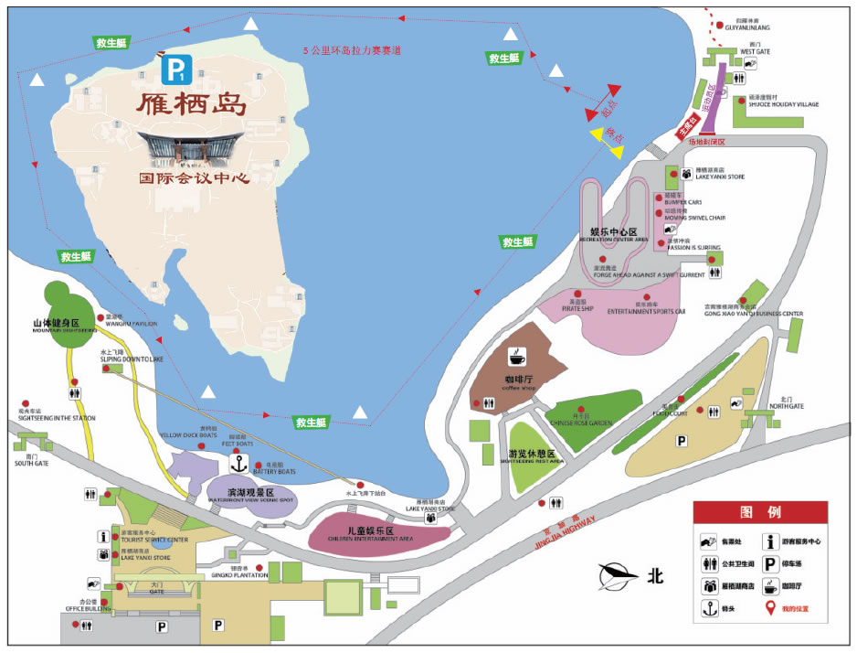 雁棲島上 核心是 雁棲湖國(guó)際會(huì)議中心。服務(wù)于大型會(huì)議。建筑主體是 “漢唐飛揚(yáng)”,前面是夏園?偨ㄖ娣e4.2萬(wàn)平方米,大小會(huì)議室、餐廳20余間,可以同時(shí)滿足近千人舉行會(huì)議和用餐。會(huì)議中心建筑內(nèi)部以H型為布局,功能核心區(qū)由位于一層的宴會(huì)廳——“鴻雁廳”和位于二層的會(huì)議大廳——“集賢廳”組成,兩側(cè)為貴賓大廳、休息區(qū)、大小會(huì)議室、包間等功能空間,宴會(huì)廳南側(cè)設(shè)室外宴會(huì)草坪,可以舉辦室外酒會(huì)等活動(dòng)。