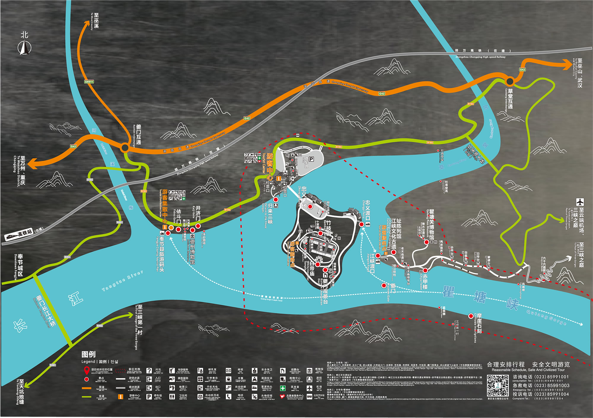白帝城·瞿塘峽景區(qū)總面積4.7平方千米,主要由白帝城、瞿塘峽兩大景區(qū)構(gòu)成,名勝古跡眾多,融自然與人文、詩情與戰(zhàn)火為一體,是飽覽長江三峽壯麗之美的起點(diǎn)。白帝城擁有多座城門,發(fā)現(xiàn)的有東門、小北門、大北門、皇殿臺甕城門(桑閤門)、小西門、西門等,白帝廟內(nèi)有明良殿、武侯祠、觀星亭等明清建筑。 瞿塘峽緊鄰白帝城,全長8千米,集雄、奇、險(xiǎn)、峻為一體,是三峽中最短、最窄、最險(xiǎn)的一段峽谷。瞿塘峽內(nèi)北岸赤甲山上有老關(guān)廟文化遺址、大溪文化遺址、巫山猿人遺址三大遺址和老關(guān)廟信號臺、赤甲樓、古炮臺、古棧道、風(fēng)箱峽懸棺等景點(diǎn);南岸白鹽山有孟良梯古棧道遺跡、摩崖石刻、犀牛望月峰、猿人峰等景觀,濃縮了中國200萬年的人類發(fā)展史。