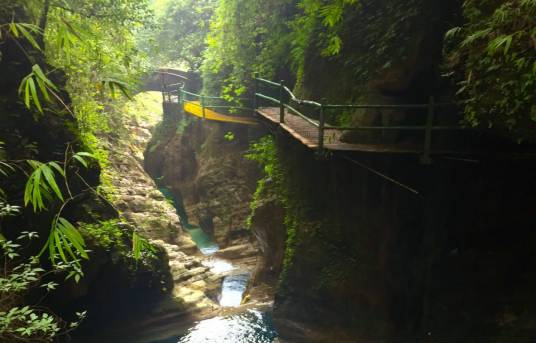 金刀峽位于重慶市北碚區(qū)金刀峽鎮(zhèn),華鎣山西南麓,是國家AAAA級旅游景區(qū)。傳說峽中有一把金刀,每當(dāng)夜晚時分,金光閃閃照耀峽谷,元朝末年,華鎣山下有一壯士張昆,此人早年靠采薪伐木為生,時常出沒于華鎣山的深山老林之中。一日,張昆迷失于一峽谷之中。當(dāng)夜正值月圓,柔柔的月光輕輕地瀉進(jìn)峽中,張昆正陶醉于此情此景,卻見峽中深處有一事物在月光映照之下發(fā)出金燦燦的光輝。張昆近一看,原來是一把插入峽壁巖石的金刀。遂上前拔刀,不想紋絲不動嵌在石縫中的金刀竟被輕輕抽出。張昆大喜:天賜金刀,定是降大任于我也!張昆憑此刀披荊斬棘,終得以出峽,金刀峽也因此而得名。金刀峽全長約10公里,分上峽、下峽兩段,其中峽谷內(nèi)棧道全長近7公里。上峽由于喀斯特地質(zhì)作用,地面切割強(qiáng)烈,形成獨特的峽谷溝壑,兩岸石壁如削,山勢岈合,垂直高度超過百米,上有古藤倒掛,下有潺潺流水;下峽由于流水侵蝕作用,有眾多洞穴群,潭潭相連,碧玉串珠,飛泉瀑布層層疊疊,古鐘乳、石筍、石柱千姿百態(tài)。主要有驚魂臺、藏刀洞、懸天飛瀑、天犬洞、神鷹峽、獅頭峽、一線天、沙溪湖、中峽天然浴場、千幻古巖、彌勒佛、心形潭等四十多個景點。