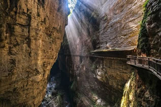 青天峽地縫全長(zhǎng)1500米,最窄處不到2米,兩岸懸崖峭壁,高度300~700米,抬頭僅見天光一線。地縫中怪石林立,鐘乳石千姿百態(tài),兩壁峭崖有的地方僅隔數(shù)尺。當(dāng)雨過(guò)天晴或正午陽(yáng)光朗照,陽(yáng)光穿透地縫,與崖壁上的流水發(fā)生折射后會(huì)形成“一米陽(yáng)光”奇觀。