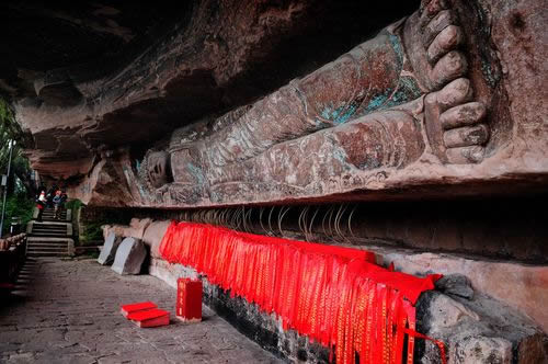 唐代懸空臥佛位于釣魚臺右下側(cè)24米處的山崖上。唐宋時期的釣魚山是著名的石佛道場,曾以精美絕倫的佛教摩崖造像馳名巴渝。相傳懸空臥佛造像系晚唐時期護國寺開山祖師石頭和尚親手鑿造。佛像在懸空的崖壁上鑿成,背北面南,頭西腳東,身長11米,肩寬2.2米,雙領(lǐng)下垂袈裟,頭為高肉髻,兩耳間距1.8米,赤足,雙腳寬1.2米。佛像袒胸露肌,面形豐滿,端莊慈祥,是一尊構(gòu)圖嚴(yán)謹(jǐn)、比例勻稱的摩崖造像。