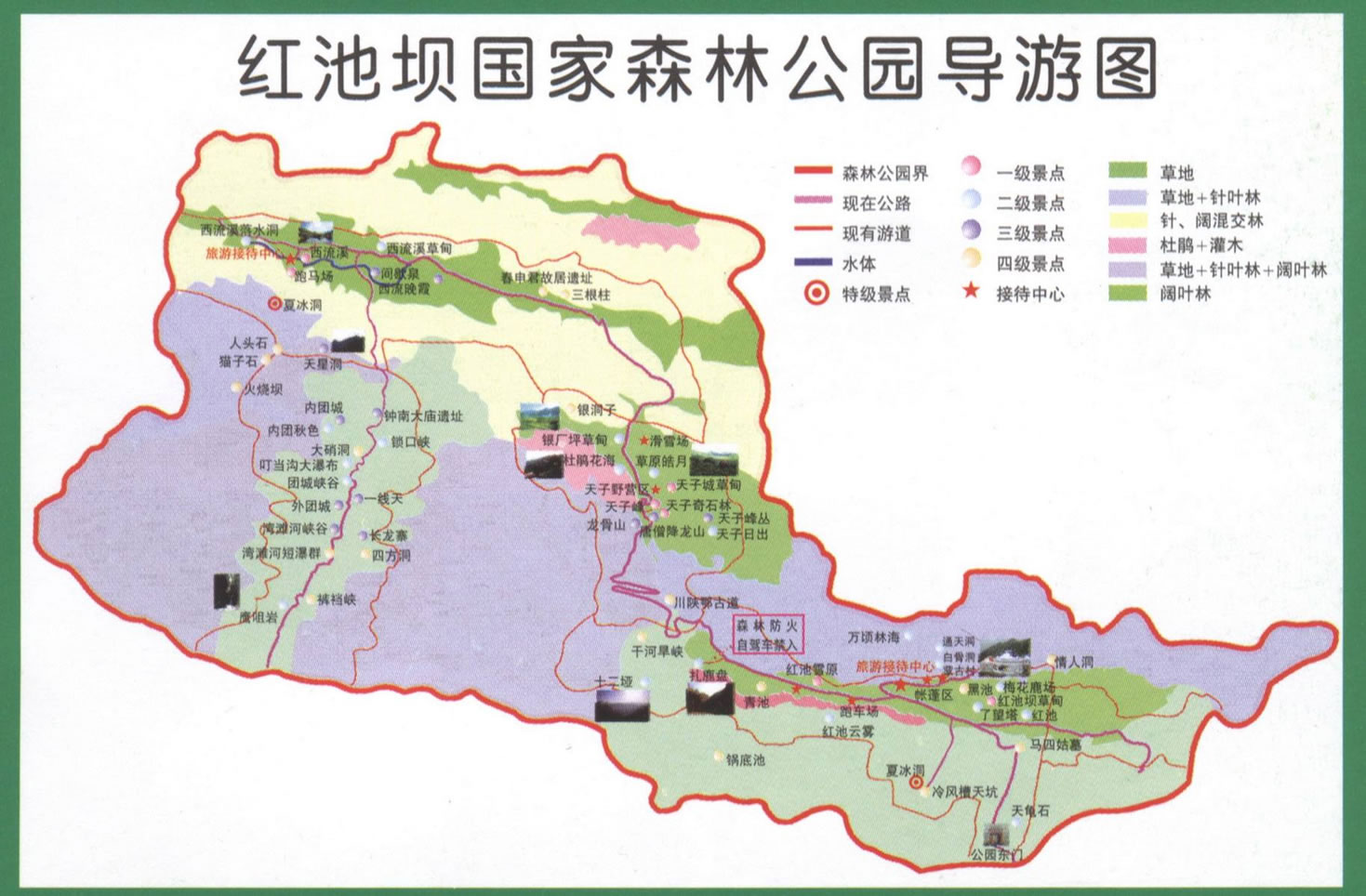 紅池壩草場(chǎng)由紅池壩、天子山、西流溪三大塊草場(chǎng)組成,面積達(dá)30余萬(wàn)畝,是全國(guó)首屈一指的高山草場(chǎng)。盛夏,紅池壩茫茫草原、姹紫嫣紅、翠綠 夏冰洞欲滴,最高溫度僅為10余攝氏度,是難得的避暑勝地;秋天,天高氣爽、蜂飛蝶舞,在此可縱馬馳騁;冬天一派銀裝素裹,北國(guó)風(fēng)光,是滑冰、滑雪的理想地方。在距草場(chǎng)不遠(yuǎn)處還有聞名中外的世界奇觀——夏冰洞,每逢盛夏,洞中滴水成冰,滿目冰川、姿態(tài)萬(wàn)千,而待數(shù)九隆冬,洞內(nèi)卻冰融水暖、細(xì)流涓涓,勝似溫泉,至今仍是一個(gè)謎。這里還是四條河流的發(fā)源地,“四異之水源于此”,巫溪縣原主管旅游的副縣長(zhǎng)、現(xiàn)縣人大主任傅主任如是向記者介紹道,南到云陽(yáng)的湯溪河、大寧河的源頭——西溪河、大寧河主要支流——后溪河、仁河這四條流向不同的河流均發(fā)源于此。