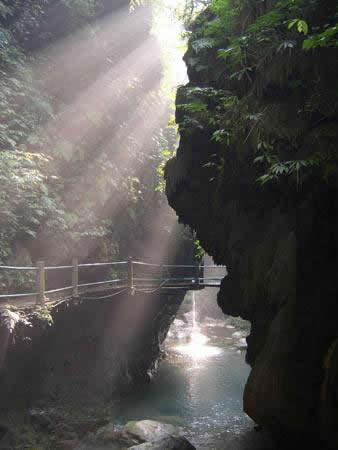 大大小小的泉水順著苔鮮爭相跳躍而下,在陽光的投射下熠熠生輝,讓你想起古人所云:“大珠小珠落玉盤!比嗽趰{中走,水在峽中飛,時隱時現(xiàn)的陽光,飛泉流瀑濺起的水霧,奇形怪狀的石乳形成一片如夢如幻的世界,這浪漫之旅,讓人留連忘返,不忍離去。