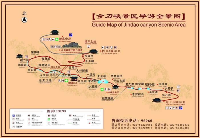 金刀峽地勢雄偉,以峽著險,以林見秀,以巖稱奇,以水顯幽。金刀峽長約10公里,分上下兩段。上段由于喀斯特地質(zhì)作用,地面切割強烈,金刀神功般形成了獨特的峽谷幽壑,石壁如削,兩山岈合,垂直高度超過百米,上有古藤倒掛,下有潺潺流水;下段由于流水侵蝕的作用,有洞穴群提高潭潭相連,飛泉瀑布層層疊疊,古鐘乳、石筍、石柱更是千姿百態(tài),堪稱全國最長的峽谷十里仿古木棧道,讓人驚嘆不已。憑棧探幽,可感悟那蘊藏于大自然山水的天地靈氣。十公里風(fēng)景線以雄、險、奇、幽著稱,集瀑、泉、洞、峽于一體。有驚魂臺、藏刀洞、懸天飛瀑、天犬洞、神鷹峽、獅頭峽、一線天、沙溪湖、中峽天然浴場、千幻古巖、彌樂佛、心形潭等四十多個景點可供游客探險、攀登和水上游樂,是人們度假避暑、踏青、回歸自然的旅游佳境,被游客譽為“夢中的香格里拉”、“中國第一險峽”。
