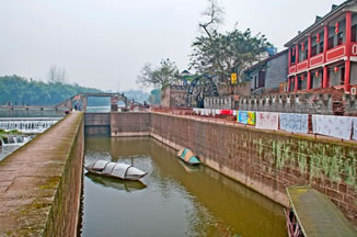 日月門(mén):系大榮寨的四大城門(mén)之北門(mén),門(mén)樓上有日月亭,門(mén)內(nèi)即煙雨巷,“橋橫古渡煙霞聚,寨聳雄關(guān)日月巡”。門(mén)內(nèi)有一甕形古井,深12.2米,內(nèi)設(shè)暗道通往河心,由重一噸多的石板遮蓋。該井系嘉慶年間修建的戰(zhàn)備設(shè)施,以備遭兵匪長(zhǎng)期圍困時(shí)取水傳信之用。