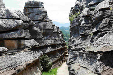 在龍鱗石海共有3處一線天,最深、最長、最美的一條深50米、長200米,寬在1米至2米,人在一線天中仰望長空,藍天僅存一線;兩邊懸崖若削,如人工堆砌而成的古城墻一般。一線天是典型的地縫溶洞地貌,經(jīng)上億年的流水沖刷而形成。