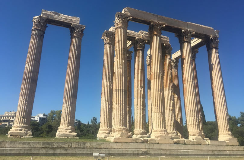 宙斯神廟 宙斯神廟位于希臘雅典衛(wèi)城東南面,是為了祭祀宙斯而建的,也是古希臘最大的神廟。宙斯神廟建于公元前470年,于公元前456年完工,由建筑師Libon設(shè)計(jì),宙斯神像則由雕刻家菲狄亞斯負(fù)責(zé)。直到公元前86年,羅馬指揮官蘇拉(Sulla)攻占雅典,破壞了尚未完成的建筑,將一部分石柱和其他建材拆下來之后,運(yùn)到羅馬。直到今天,在羅馬市中心的古羅馬廣場(chǎng)遺址上,還能看見它們。宙斯廟尤以象牙和黃金的塑像而聞名于世。 宙斯神廟是伊奧尼亞風(fēng)格的建筑,后來改用了科林斯式石柱風(fēng)格,而且一概使用大理石。整個(gè)建筑坐落在一塊205米長(zhǎng),130米寬的地基上,神廟本身長(zhǎng)107.75米,寬41米,共有104根科林斯柱。每根石柱高達(dá)17.25米,頂端直徑達(dá)1.3米,約計(jì)用大理石1.55萬噸。和眾多的古希臘神廟一樣,宙斯神廟也遭受嚴(yán)重的破壞,104根柱子中僅存13根。宙斯神廟和哈德良拱門隔路相望,宙斯神廟位于路南,而哈德良拱門則位于路北,這兩座建筑都是由距今1900多年前的羅馬帝國(guó)國(guó)王哈德良時(shí)期修建的。我們已經(jīng)無法看到宙斯神廟和哈德良拱門的原始形態(tài),只能通過斷壁殘?jiān)珌砘貞洰?dāng)時(shí)的輝煌。