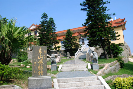 東山博物館,1988年6月開館,1995年3月建成三層樓新館,建筑面積986平方米,占地1400多平方米,館內(nèi)設(shè)有“文物室”、“閩臺史前文化關(guān)系陳列室”、“陳洪甄書畫室”、“東山建縣八十周年建設(shè)成就回顧展“等展室。展出舊石器時代、新石器時代以及歷代文物、圖片、拓片等700多件。其中有東山人“化石”,萬年前舊石器、各種動物(鹿、熊、象、犀牛、羊)化石,還有石器、銅器、陶瓷器、玉器、木雕、古今兵器、書畫、民俗文物及一艘從臺灣飄來的臺灣高山族獨(dú)木舟等。