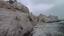 湄洲祖廟后方巖石上,有“升天古跡”、“觀瀾”等石刻。站在石上,顧盼茫茫大海,白鷗掠波,舟揖穿梭;山海相銜,海天相接。前方巖岸海床有大片輝綠巖,受風(fēng)濤沖蝕,形成天然凹槽,潮汐吞吐之聲,由遠(yuǎn)而近,初似管弦細(xì)響,繼如鐘鼓齊鳴,再若龍吟虎嘯,終則像巨雷震天,驟雨瀉地?廴诵南业摹颁貛Z潮音”因而馳名。