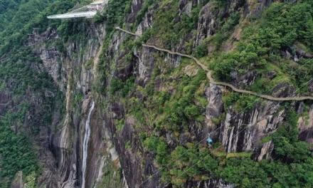 心形懸崖棧道位于岱仙瀑布兩側(cè),從遠(yuǎn)處看,兩邊的棧道整體呈一個(gè)心形,蜿蜒盤(pán)桓在崖壁上,心形棧道全程3000米,高差314米,是國(guó)內(nèi)難得一見(jiàn)的心形立體環(huán)瀑棧道。
