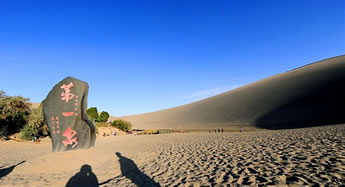鳴沙山以沙動(dòng)成響而得名。東漢稱沙角山,俗名神沙山,晉代始稱鳴沙山,其山東西長(zhǎng)40余公里,南北寬約20公里,主峰海拔1715米。峰巒危峭,山脊如刃,人馬踐墜,經(jīng)宿復(fù)初;人乘沙流,有鼓角之聲,輕如絲竹,重若雷鳴,故稱“沙嶺晴鳴”,為敦煌八景之一。