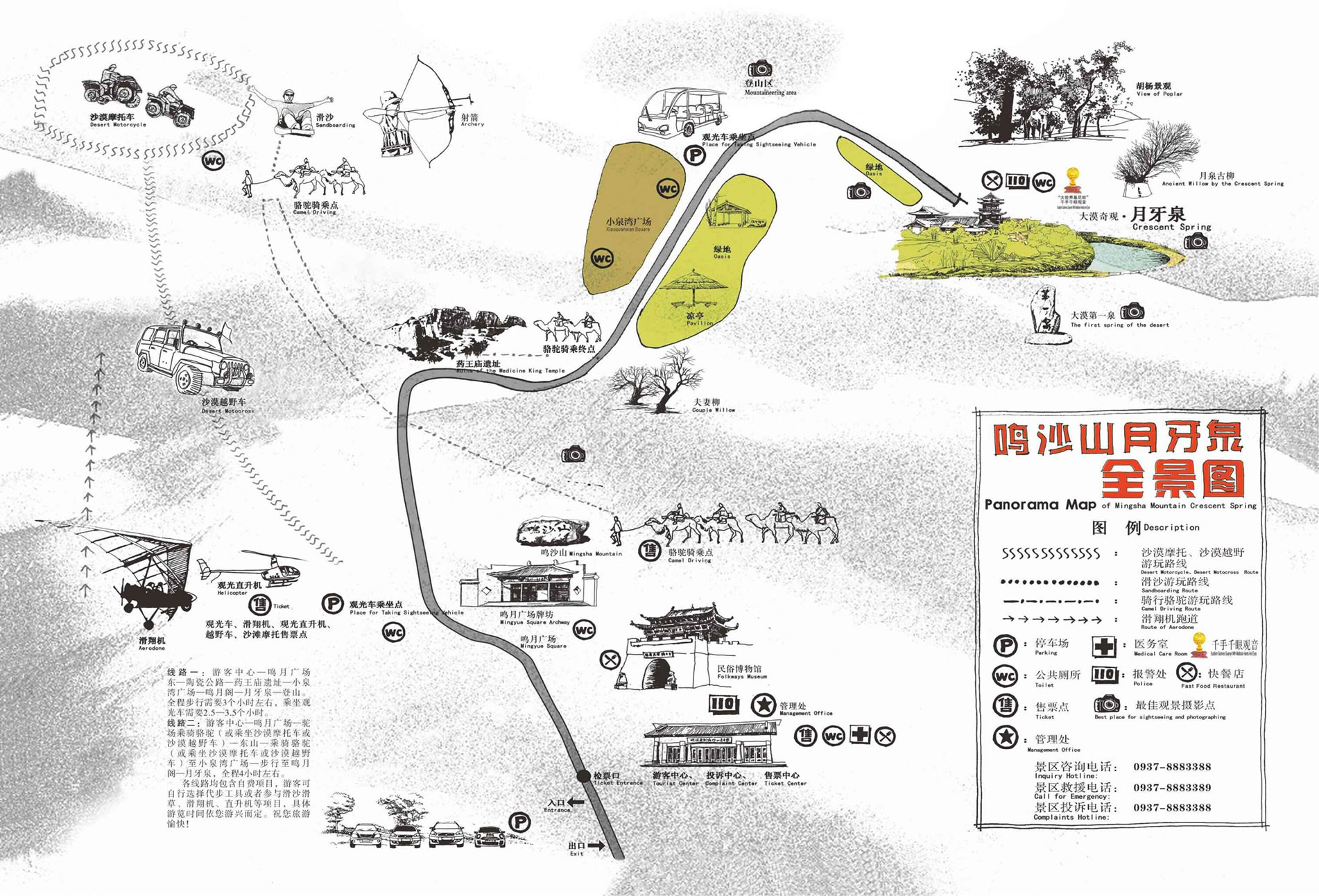 | 敦煌鳴沙山月牙泉景區(qū)位于甘肅省敦煌市城南5千米處,景區(qū)范圍界定為76.82平方千米,核心景區(qū)面積界定為12.79平方千米,規(guī)劃外圍控制地帶面積為136.04平方千米。景區(qū)內(nèi)地貌主要有大、小泉灣和周?chē)镍Q沙山組成。小泉灣是間于東沙山與北沙山的洼地,主要用于辦公和生活區(qū)。大泉灣是北沙山與南山之間的洼地,月牙泉和月泉閣等古建筑群分布其內(nèi),也是景區(qū)的核心。