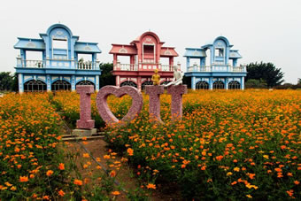 三座粉、藍相間的巨型迪斯尼風(fēng)格門樓,一片橙色的仙女花在陽光恬靜地流敞著。七個巨型的氣球“串”綻放繽紛色彩,邊上還圍著精美的花柱。香格里拉,正如其名,有著一種永恒、和平、寧靜的 “世外桃源”。