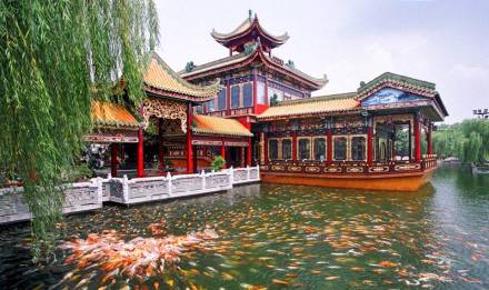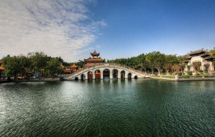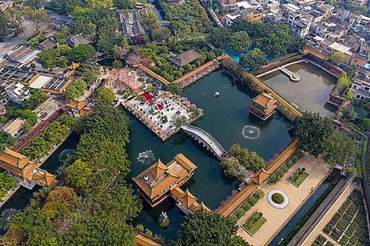 正門的白石仿古牌坊,雄偉巍峨,巧奪天工。園中的陶塑、瓷塑、磚雕、灰塑、石刻、木雕等藝術精品琳瑯滿目。驚世之作,當數(shù)已列入大世界吉尼斯之最的瓷塑浮雕《清明上河圖》和巨幅磚雕《吐艷和鳴壁》。荔島中的聚家閣金碧輝煌,雍容華麗,閣內(nèi)供奉著萬世師表孔子銅像,供游人瞻仰。