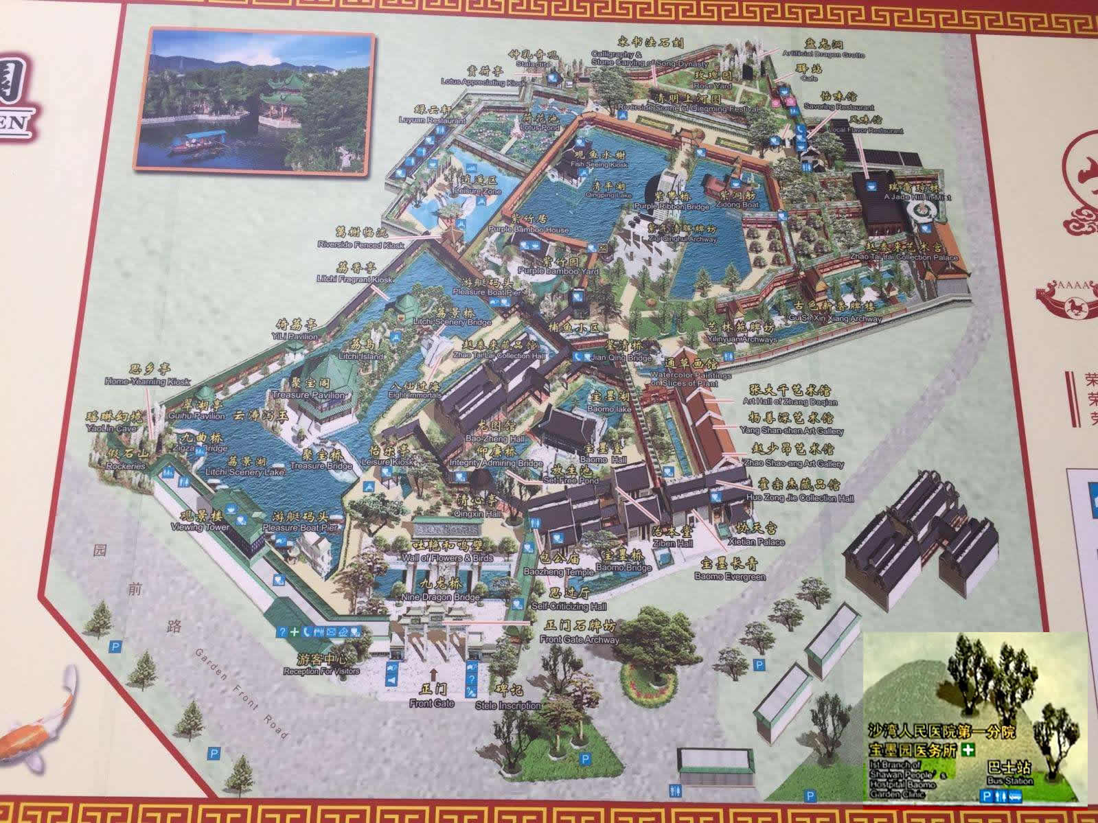 寶墨園內(nèi)共有治本堂、寶墨堂、清心亭、仰廉橋、紫洞舫、龍圖館、千象回廊和風味食街這8大景區(qū),40多個景點,30多座石橋,河湖眾多,流水縱橫,建筑、園林、山水、石橋。陶塑、灰塑、石雕、磚雕、木雕、石刻、彩繪、嵌瓷等藝術精品琳瑯滿目,各展館珍藏、陳列了大批文物古董和名家的書畫。