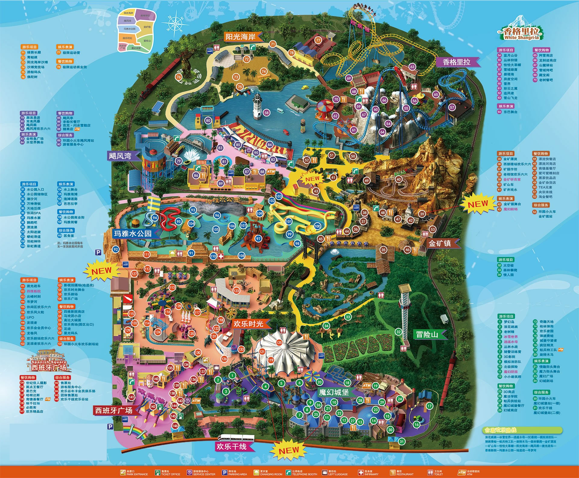 全公園共分八大主題區(qū):西班牙廣場(chǎng)、卡通城、冒險(xiǎn)山、歡樂島、金礦鎮(zhèn)、香格里拉森林、颶風(fēng)灣、陽(yáng)光海岸,加上奇趣的瑪雅水公園,有一百多個(gè)老少皆宜、豐富多彩的游樂項(xiàng)目。從美國(guó)、荷蘭、德國(guó)等發(fā)達(dá)國(guó)家引入眾多全國(guó)乃至亞洲獨(dú)有的項(xiàng)目:世界最高落差的"激流勇進(jìn)"、中國(guó)第一座懸掛式過山車"雪山飛龍"、中國(guó)第一座巷道式"礦山車"、中國(guó)第一座"完美風(fēng)暴"、中國(guó)第一輛"仿古典式環(huán)園小火車"、亞洲最高、中國(guó)第一座"驚險(xiǎn)之塔"--太空梭、亞洲首座集視覺、聽覺、觸覺于一體的四維影院。這些游樂項(xiàng)目附以了逼真而完美的主題包裝,營(yíng)造出環(huán)境優(yōu)美宜人,具有美國(guó)西部和中國(guó)藏北風(fēng)格的景觀。一次次驚心動(dòng)魄的歷程,一個(gè)個(gè)撲朔迷離的故事,讓游客仿佛進(jìn)入一個(gè)亦真亦幻的神秘境界。