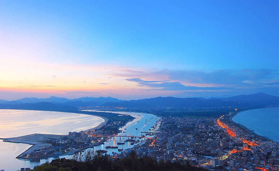 雙月灣位于惠東縣港口濱海旅游度假區(qū),地處惠東縣稔平半島的南端,三面環(huán)海,因形狀鳥瞰似兩輪新月,故名“雙月灣”。雙月灣共分兩灣,由大亞灣和虹海灣相鄰的兩個(gè)半月形組成。左灣水平如鏡,右灣波濤洶涌,兩條沙垅直奔大星山,如蛟龍出海,似雙龍戲珠,有靜有動,十分壯麗。