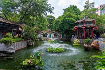 在花木配置方面,園內(nèi)花卉果木逾百種,除了嶺南園林常用的果樹(shù),還栽種了蘇杭園林特有的紫竹、枸骨、紫藤、五針?biāo)伞⒔疱X(qián)松、七瓜楓、羽毛楓等,并從山東等地搜集了龍順棗、龍瓜槐等北京樹(shù)種,其中銀杏、沙柳、紫藤、龍眼、水松等古木樹(shù)齡已百年有余。