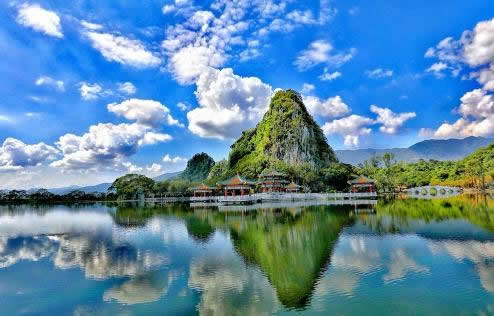 七星巖以喀斯特溶巖地貌的巖峰、湖泊景觀為主要特色,七座排列如北斗七星的石灰?guī)r巖峰巧布在面積達(dá)6.3平方公里的湖面上,20余公里長的湖堤把湖面分割成五大湖,風(fēng)光旖旎。被譽(yù)為“人間仙境”、“嶺南第一奇觀”。