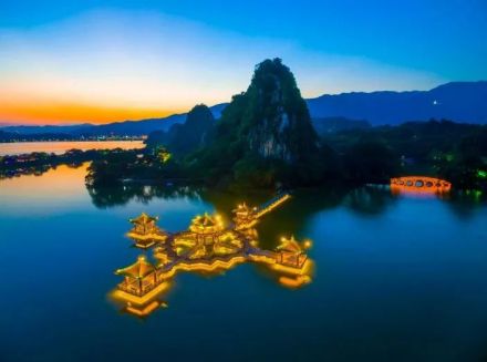 以不同的顏色交錯投射到景物上,勾畫出七星巖景區(qū)內(nèi)神秘幽雅的堤岸、小橋,花木,巖山與湖水交相輝映,使夜幕下的七星巖更加絢麗多彩;同時開辟了星湖夜游項(xiàng)目,為廣大市民和游客在夜色中游湖觀光提供了一個美麗的環(huán)境 ,再造出“第二星湖”。增加了許多新的景點(diǎn),如牌坊文化廣場,每當(dāng)夜幕降臨,霓虹閃耀,游人如鯽,當(dāng)露天音樂噴泉啟動之時,七星巖牌坊廣場更顯得壯觀,每逢周末或節(jié)假日,這里還可以欣賞一臺臺豐富多彩的文藝節(jié)目,真是令人如醉如癡。位于星巖東面的仙女湖,每當(dāng)太陽西下,還可以觀賞到天然奇觀--臥佛吞日。