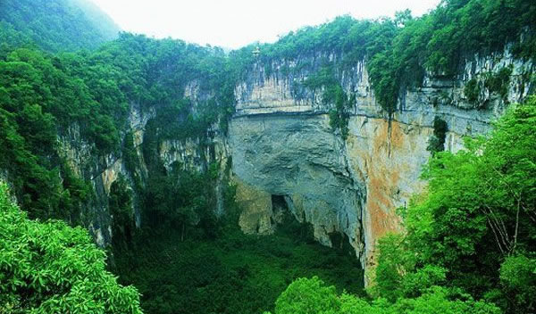大石圍天坑位于樂業(yè)縣同樂鎮(zhèn)刷把村北邊,距縣城23公里,屬紅水河南端的干熱河谷地帶,是整個"天坑"溶洞群中的最有代表性,也是最有名的景點之一,有"天然絕壁地宮"之美稱。大石圍天坑地下原始森林面積10.5萬平方米,垂直深度613米,東西長600米,南北寬420米,容積約0.8億立方米,其地下森林面積位居世界第一,深度位居世界第二,容積位居世界第三。原始森林底部地下溶洞高50~200米,寬70~150米,洞中有兩條寬7~13米的地下暗河,是廣西目前河流量最大、流程最遠(yuǎn)的地下暗河之一。兩條暗河中,一條冷,一條暖,冷暖兩條河流長約30公里,被稱為鴛鴦暗河。河里有許多的地下水生生物,最具特色的是通體透明的盲魚,河岸兩旁有金黃的沙灘和五彩的奇石及巨大的化學(xué)沉積物。大石圍天坑底部暗河下游6公里處,有一處寬30--50米,高約100多米的瀑布,被專家稱為地下第一大型瀑布。