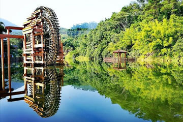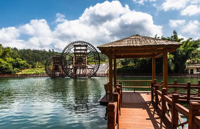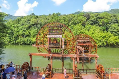 位于八寨溝景區(qū)大門外,是一個人工湖,湖面寬廣,三面環(huán)山,景色秀麗,可乘木船游覽龍珠湖風(fēng)光,混凝土大壩外有人工瀑布,瀑布下面是深水潭,有一架仿古大水車,在流水驅(qū)動下不停轉(zhuǎn)動。