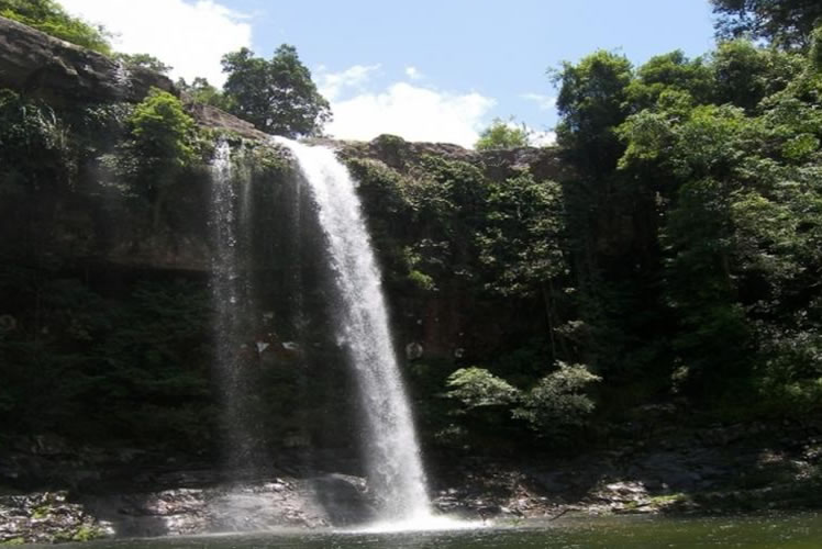 應(yīng)天瀑布在十萬大山掃把山下,瑤寨念文屯西南3千米的山谷中。瀑布落山外,巖板稍平闊,水口呈“凹”狀,飛瀑處壁形,高28米,巖壁間有一凹處;深寬均數(shù)米,形似“水簾洞”。春夏大雨,山洪暴發(fā);瀑布響聲如雷,數(shù)里外還震人耳膜,“應(yīng)天泉”由此而名。瀑下數(shù)十米,巨石如象;沉列溪中,同一溪流,距此瀑布約百米和二百米處,還有兩處小瀑布,高度均約十余米,當(dāng)?shù)厝朔Q應(yīng)天瀑布為“頭龍”,下面小瀑布為“二龍”和“三龍”。