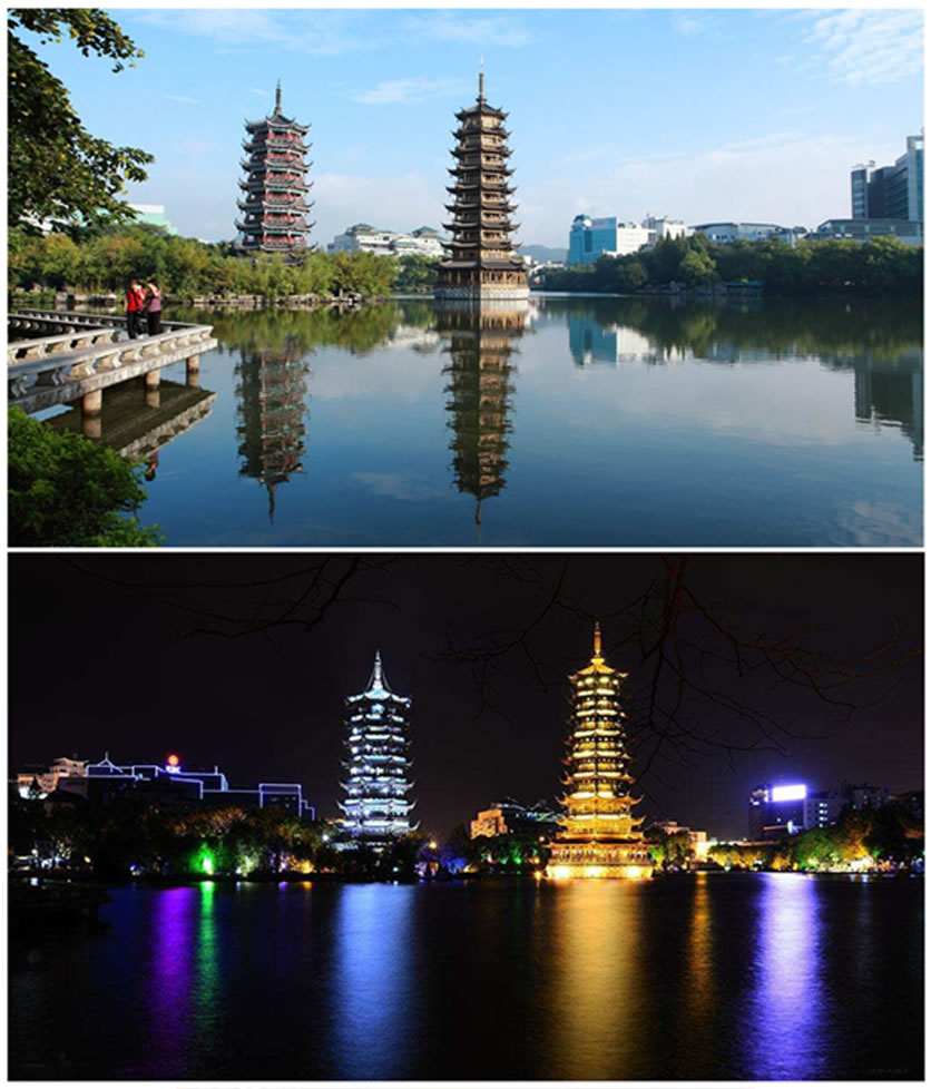 日月雙塔地處桂林市中心區(qū),坐落在桂林城的中軸線上,與“象山水月”相鄰。象山是桂林的城徽,而雙塔則是新桂林的標(biāo)識(shí)。日塔、月塔與象山上的普賢塔、塔山上的壽佛塔,相互呼應(yīng),相互映襯,有“四塔同美”之說(shuō)。桂林日月雙塔號(hào)稱世界第一銅塔,是桂林旅游的一個(gè)夜景觀賞地。