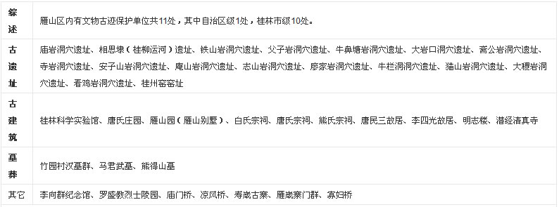 雁山區(qū)境內(nèi)風(fēng)景名勝有漓江、相思江、冠巖、父子巖等山水自然風(fēng)貌;有雁山公園、唐氏莊園、相思埭遺址、廟巖洞穴遺址、桂州窯窯址、竹園漢墓群、馬君武墓、羅盛教烈士陵園等自治區(qū)、市文物保護單位;有壽崴古寨、雁咸古寨門、潛經(jīng)白氏宗祠、潛經(jīng)清真寺、竹園廟門橋等古寨古建筑;有冠巖景區(qū)、愚自樂園、雁山植物園、神龍谷、蛇王李莊園、龍門古榕等生態(tài)園林人文融合景觀。其中漓江雁山段是桂林漓江景區(qū)5A級景區(qū)的一部分;桂林冠巖景區(qū)、愚自樂園是4A級景區(qū);神龍水世界景區(qū)、多耶古寨——蛇王李景區(qū)是3A級景區(qū)。