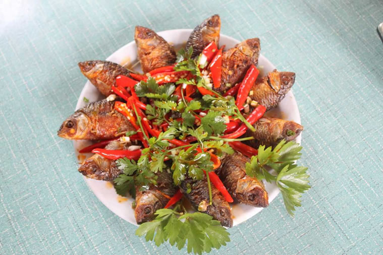全州禾花魚 全州禾花魚,為長(zhǎng)時(shí)期稻田放養(yǎng)馴化選育品種,因食水稻落花而得名。最遠(yuǎn)可追溯至漢代,唐昭寧年間,劉恂在《嶺表錄異》中有詳細(xì)文字記載。乾隆時(shí)成朝廷貢品,譽(yù)滿京城。禾花魚年產(chǎn)兩次,總產(chǎn)量1000噸左右,以重約1兩至2兩,長(zhǎng)約2至3寸為宜。有青蒸、水煮、紅燜、油炸、煎、火烤、煙熏等十余種吃法。