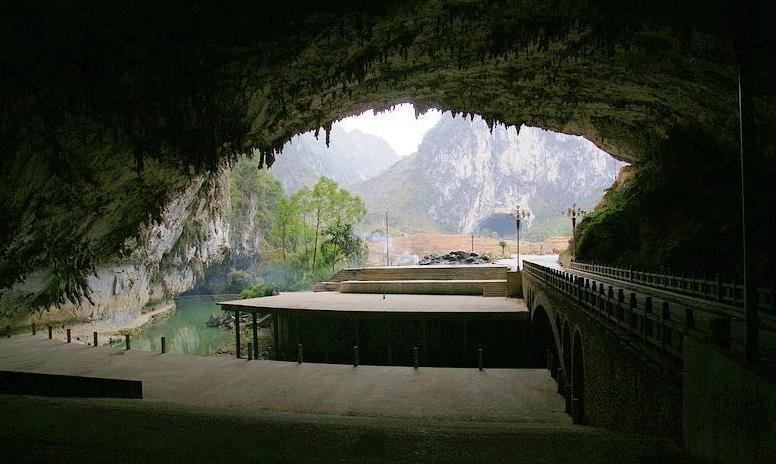 穿龍巖,位于縣城內(nèi)西北面,因其古時(shí)候?yàn)槁啡瞬叫腥氤堑谋亟?jīng)之道而又名鳳陽關(guān)。其西南面石壁高約180m,130m處有一小溶洞,被稱作鳳山的“鳳眼”,夕陽晚照,滿壁金光,為鳳山八景之一“丹崖晚照”。穿龍巖南面洞口寬約80m,高約30m,其中河床寬約20m。整個(gè)穿龍巖最寬約200m(含河床寬度),深度為400m,最高高度約100m,洞廳面積4.15萬平方米,排名中國第五。