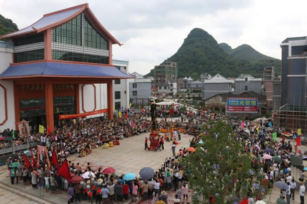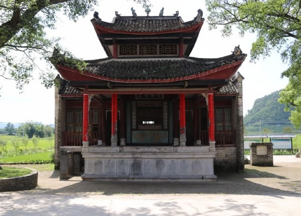 位于鐘山縣城西面公安鎮(zhèn)大田村,距縣城約十公里,此戲臺建于清光緒四年(即1878年),為磚、石、木結(jié)構(gòu),呈凸字形,通高10余米,由前臺和后臺 組成,前臺面寬6.37米,深5.5米;后臺寬10.12米,深3.6米;基高1.8米。整座戲臺青石青磚,雕工極為精美圓潤,八柱梁構(gòu)架,八角藻井復 頂,鼓石墊柱,青磚砌墻,青石為基,基旁雕以八仙賀壽,鑿雙龍以戲珠,臺上鏤兩虎以扶角,嵌二獅以呈瑞,后屏風飾以山川樓閣,彩鳳仙鶴等木雕,工藝精湛, 構(gòu)圖和諧。戲臺除古樸典雅、雄偉壯觀,且符合力學、聲學原理,整座戲臺屬水口廟附屬建筑,隱映于古樹秀竹之中,清澈的溪流環(huán)繞其中,整個環(huán)境優(yōu)雅別致,清 靜恬適,為廣西不可多見的古戲臺之古代建筑之一。1981年列為廣西壯族自治區(qū)重點文物保護單位。該戲臺所處村莊大田村也是一個很有特點的村莊,老屋、古 榕、古樟在池塘的映襯下顯得特有韻味。