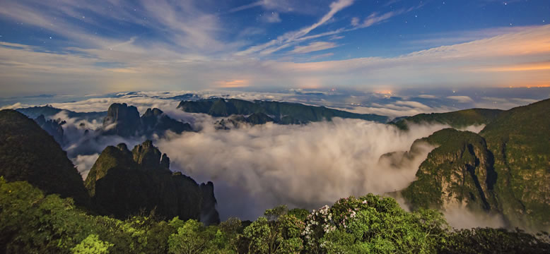 圣堂山景區(qū)位于金秀縣城南面,距金秀縣城38公里,距柳州市區(qū)134公里,距桂林市區(qū)210公里,距南寧市區(qū)329公里,距來賓市區(qū)224公里,景區(qū)面積約120平方公里,山體結構架由7座海拔1600米以上巍峨奇異的群峰組成,主峰海拔1979米,為桂中第一高峰、廣西第五高峰。圣堂山山體龐大、崎嶇陡峭、怪石嶙峋,山上神奇秀麗的萬畝變色杜鵑林,變幻莫測的云海迷霧,奇松怪樹,古樸原始,自然生態(tài)優(yōu)良,物種豐富,森林覆蓋率達95.6%,具有雄、奇、險、秀、古、野等獨特景觀特色。 景區(qū)小氣候特征明顯,氣象瞬息萬變、幻化莫測,負氧離子含量最高達138000個每立方厘米,年均氣溫17℃左右,冬暖夏涼,是華南不可多得的避暑勝地和自然景觀,是最受瑤山人民推崇的“圣山”。景區(qū)先后獲評國家森林公園、國家級自然保護區(qū)、國家AAAA級旅游景區(qū)、中國森林旅游美景推廣地,自治區(qū)級生態(tài)旅游示范區(qū)自治區(qū)級森林康養(yǎng)基地等稱號。