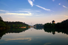 靈湖是一個(gè)自然湖泊,素有小西湖之美譽(yù),湖面寬780畝,其最深的地方可達(dá)30米。其水來自廣西靈川縣海洋鄉(xiāng)的海洋河。水質(zhì)清澈冰涼,四周青松翠柏倒影湖中,猶如一幅淡淡的山水潑墨畫!八鉃囦偾绶胶,山色空蒙雨亦奇”