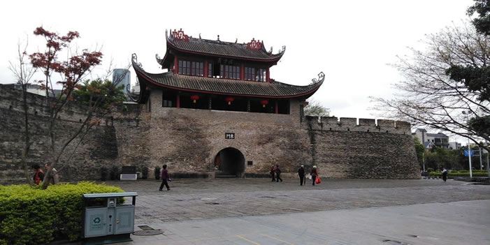柳州東門城樓建筑建成于明初,城基皆用蕊石,墻用厚磚。城門上鑲有石刻“東門”二字,署“洪武十四年四月立”。明代東樓于清代嘉慶年間曾遭火災(zāi),光緒元年由柳州名建造師姓郭的(佚其名)重建。