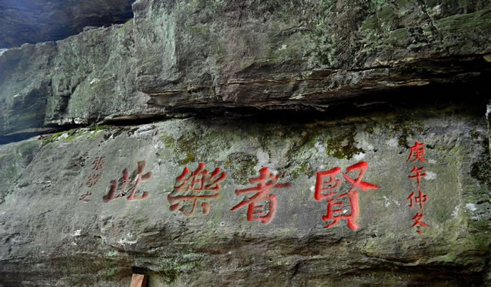 西祖巖摩崖石刻在平山鄉(xiāng)金洞村(現(xiàn)叫紅巖)東600米西祖巖壁上。有幅直寫(xiě)顏體“西祖巖”三字(字徑60×60厘米),上款“嘉定丙子六月朔日”,下款“轉(zhuǎn)運(yùn)判官方信儒題”。有幅直寫(xiě)草書(shū)“無(wú)崖別境”(字徑30×30厘米),上款“道光已丑六月朔日”,下款“州同知吳元鷗題”。有幅草書(shū)“薅”一字(字徑90×40厘米),上款“道光已丑六朔日”,下款“舉人吳元鶴題”。在巖廳正面,尚見(jiàn)幾幅殘存浮雕(每幅60×30厘米),有“禹跳龍門(mén)”、“麒麟戲珠”、“慈竹”、“寒梅”畫(huà)幅。