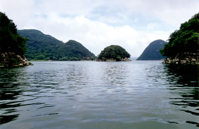 南湖的面積最大,景點也最多,南湖以洞多洞奇揚名。首先映入眼簾的,是一組奇目的山巖壁石,這是小巧瓏朗而又天然形成的“盆景山”。這里的石頭色彩特別豐富,青灰和棕黃的頁巖直插入碧水之中。大湖面逐漸狹窄,這兩邊的巖岸,如同斧劈劍削,有些游人把它呼為“小三峽”;這一片景觀石峰林立,如同到插的刀劍,給秀美的湖水增添幾許陽剛之氣,人們把它稱為“小石林”;這里的巖石,別有風姿,它橫看不成嶺,側看不成峰,一片又一片向上堆積,有如卷幟浩繁的典籍,人們把它稱為“峭壁天書”。