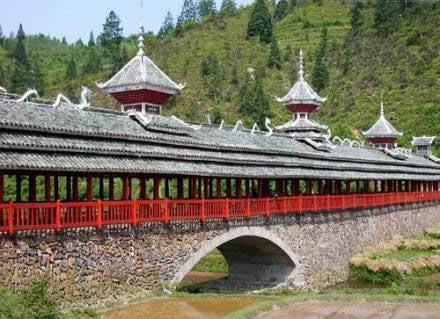 在侗鄉(xiāng)能和鼓樓媲美的,是侗寨的風雨撟,俗稱花撟。凡侗族人聚居地區(qū),有河必有撟,撟梁全都建筑在村前寨后的交通要道上。大部分為木撟,還有石拱撟石板撟竹筏撟等,寬四五米。青石作墩,杉木鋪撟面,上面是瓦頂長廊。長廊兩旁設欄桿長凳,形如游廊,可供行人躲避風雨,觀賞休憩。