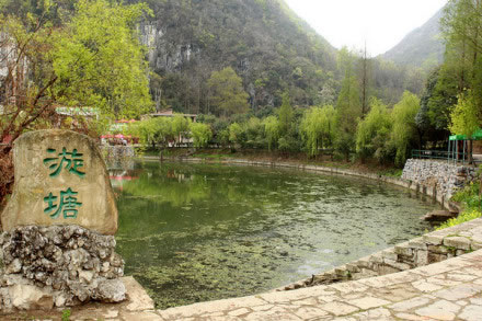 漩塘是國家級風(fēng)景名勝區(qū),在龍宮的上游。一個面積達(dá)萬余平方米的圓塘,池水不借風(fēng)力,日日夜夜、年年歲歲永不停歇地沿著順時針方向旋轉(zhuǎn)著。景象珍奇,令游客陶醉。通漩河的水流到這里便沉入地下,變?yōu)榈叵掳岛印L撩娉蕡A形,一年四季塘水以順時針方向,挾帶水上綠色浮萍不停地漩轉(zhuǎn),終年不息。