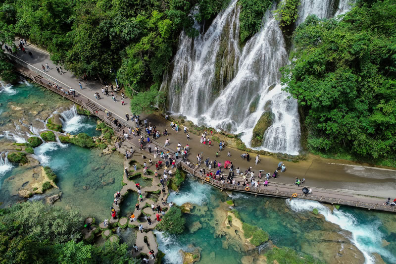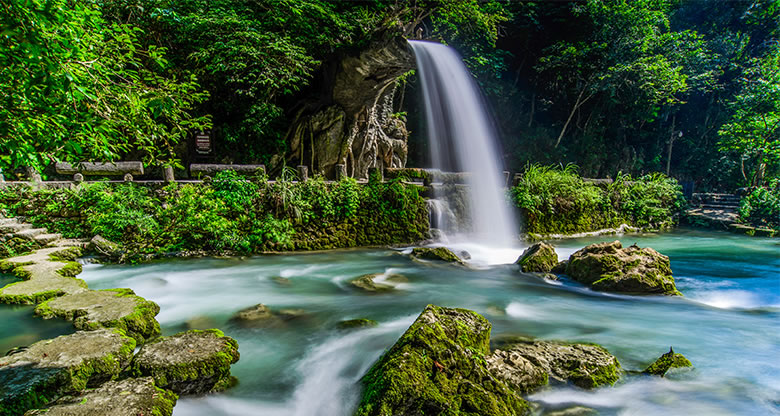 小七孔橋位于響水河上,建于清代道光十五年(1835年)橋下七孔,橫跨響水河,位于景區(qū)之首,景區(qū)之名由橋而得。這是一座小巧玲瓏的七孔古石橋,橋長25米,橋面寬1.8米,拱高4米,建于清道光年間,昔為溝通荔波至廣西的重要橋梁,橋由麻石條砌成,橋身爬滿藤募和蕨類,古色古香的橋下是涵碧潭。兩岸古木參天,巨大的虬枝沿著橋伸臂,宛如巨傘撐在橋上。