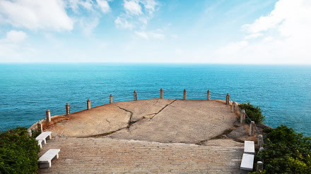 觀日巖位于蜈支洲島的東南懸崖處。站在巖上憑海臨風(fēng),俯瞰全島,遼闊的南海盡收眼底。懸崖下面,怪石嶙峋。 風(fēng)平浪靜之時(shí),乘快艇環(huán)島游,石景千奇百怪,觀日巖像一尊天然大石佛,面向大海,日夜修煉。新世紀(jì)的曙光從這里升起,緋紅的太陽(yáng)從海面上徐徐上升,形成海天一色的海上觀日點(diǎn)。住島客人若欲觀看日出,可向酒店前臺(tái)咨詢?nèi)粘鰰r(shí)間。